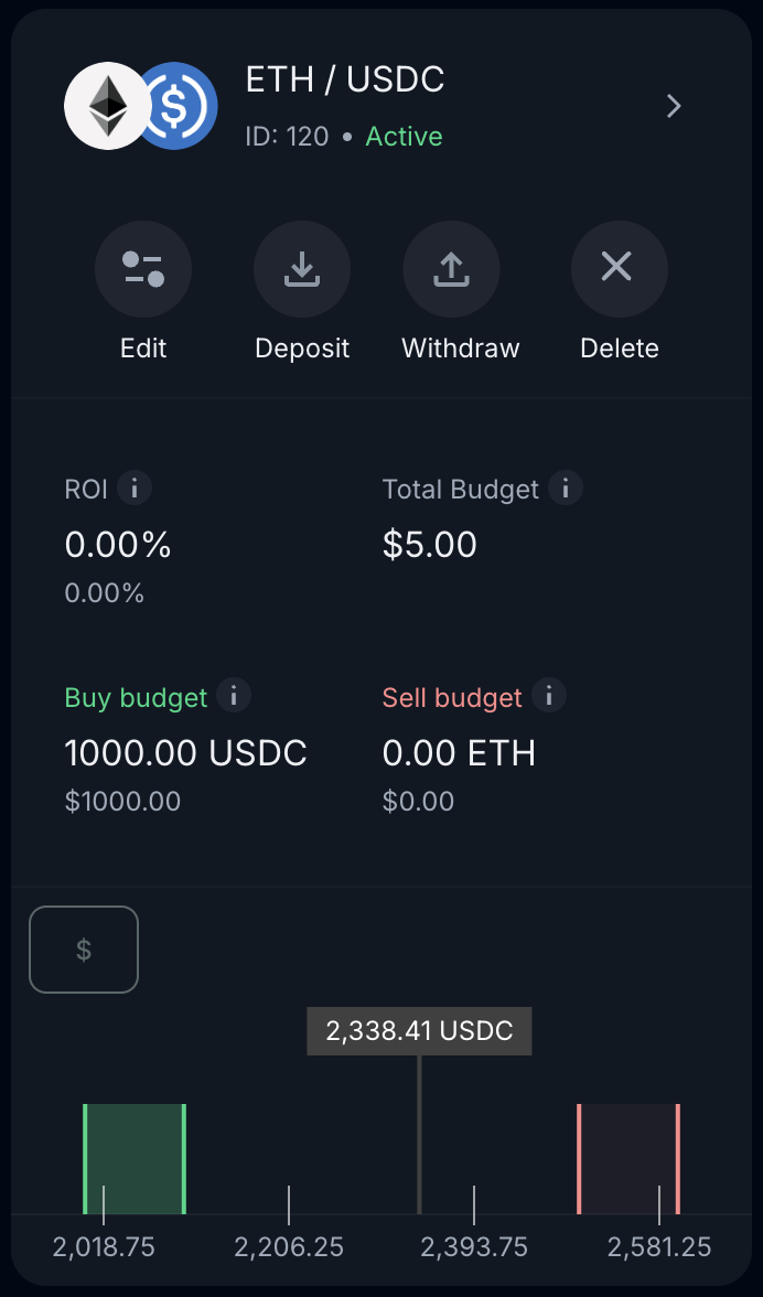 We fund the Buy Budget with 1000 USDC. Our USDC will be converted into ETH whenever the ETH market price enters the Buy Range.